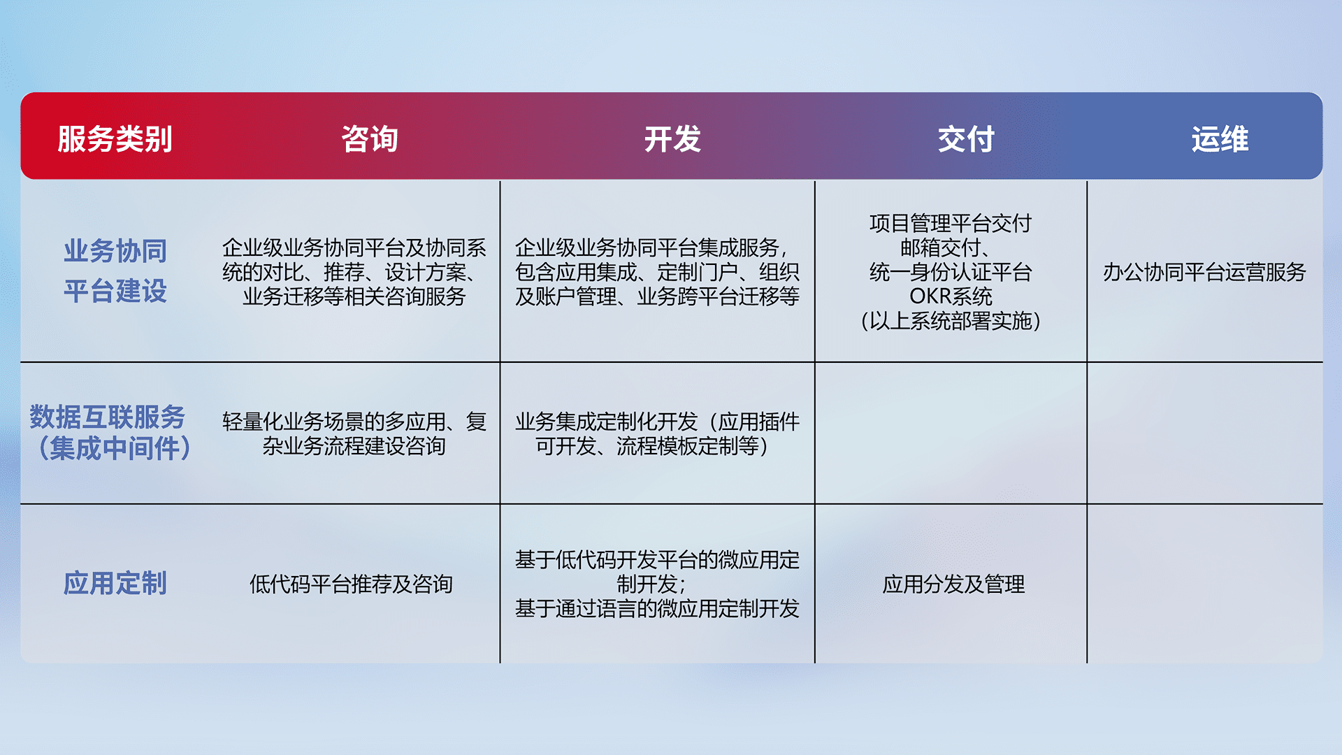 针对钉钉、、、企微、、IDaas等平台级产品提供产品的规划、、方案、、交付、、定制化开发等服务,,,实现如统一协同办公、、、智能客户服务、、、混合会议管理、、智能数据查询、、、、等业务场景,,,实现数字化转型。。。。